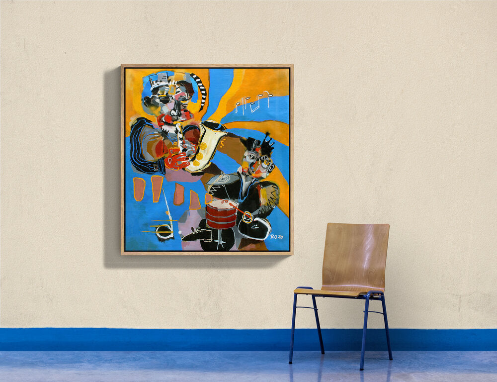 This large, original painting titled "A Love Supreme" is approximately 54x60 inches (when stretched) in acrylic, spray paint and oil stick on canvas. This painting is inspired by and takes you deep into the universe of musicians. The title is a reference to John Coltrane's "A Love Supreme", the notes are the legendary intro notes of the tune. Due to its large size this colorful work ships rolled up in a large mailing tube.