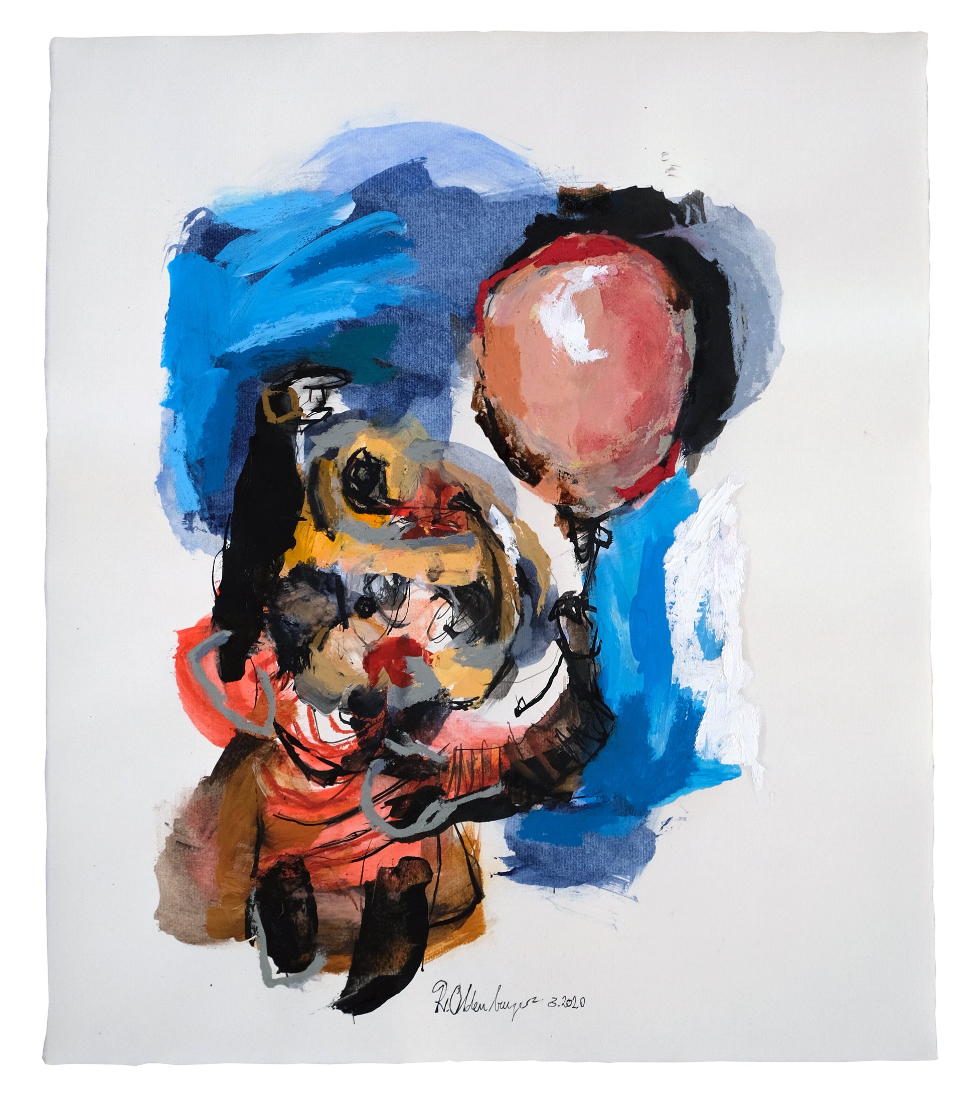 This original work on paper titled "Child with Balloon" is 15x18 inches in ink, acrylic, pastel, oil pastel and water color on Hahnemühle paper. It was made in Los Angeles, 2020 and is signed and dated on the front. This work will ship in a cardboard box with a certificate of authenticity included.