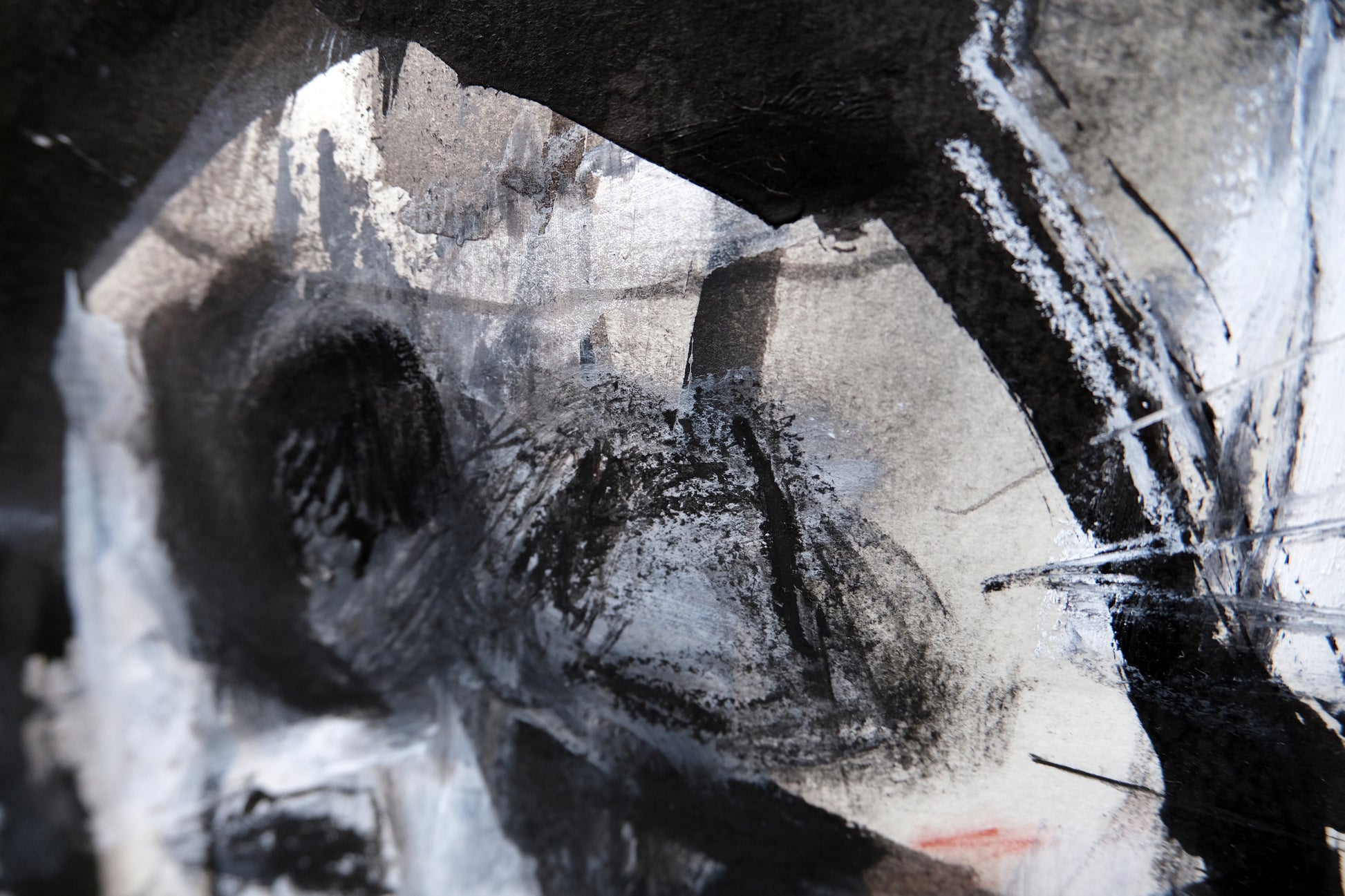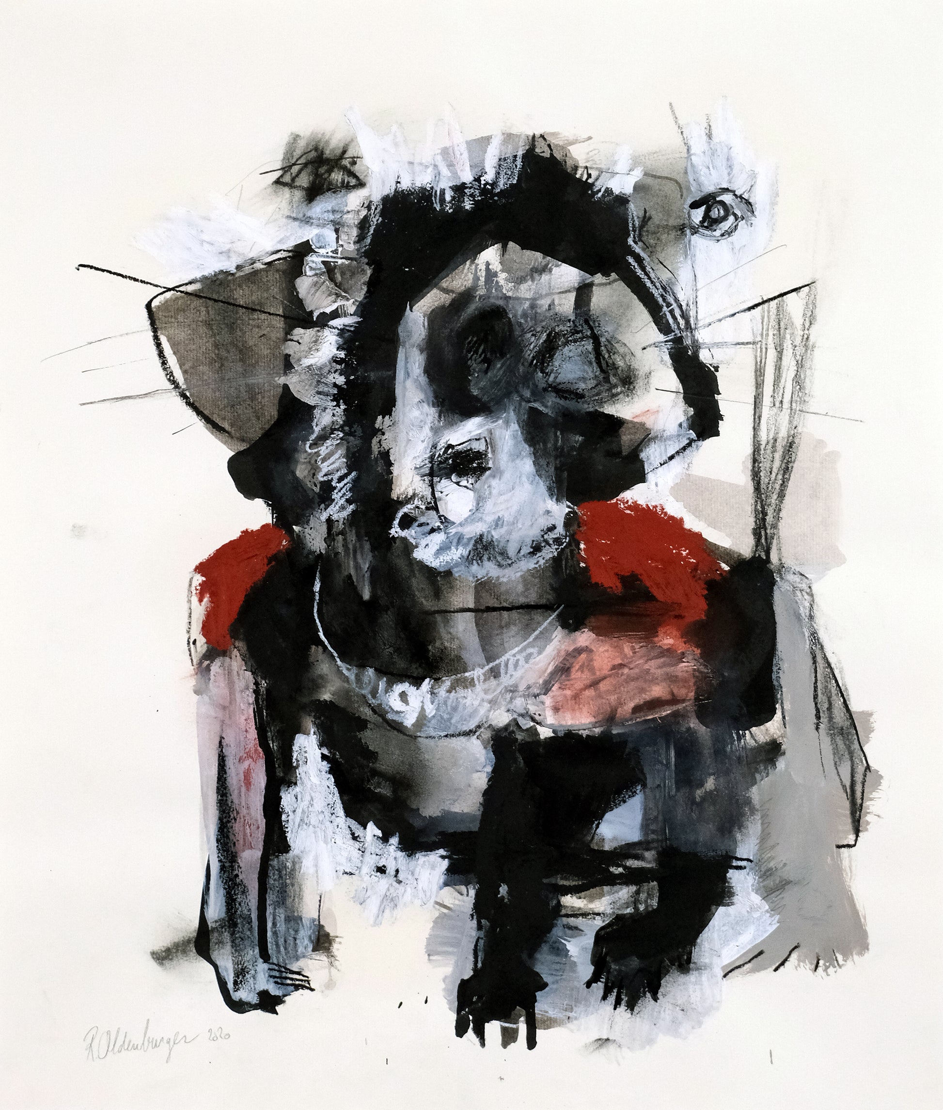 This original painting titled "Scruffy Dog" is 15x18 inches in ink, acrylic, oil pastel and charcoal on Hahnemühle paper. It was made in Los Angeles, September 2020 and is signed and dated on the front. This work will ship in a cardboard box with a certificate of authenticity included.