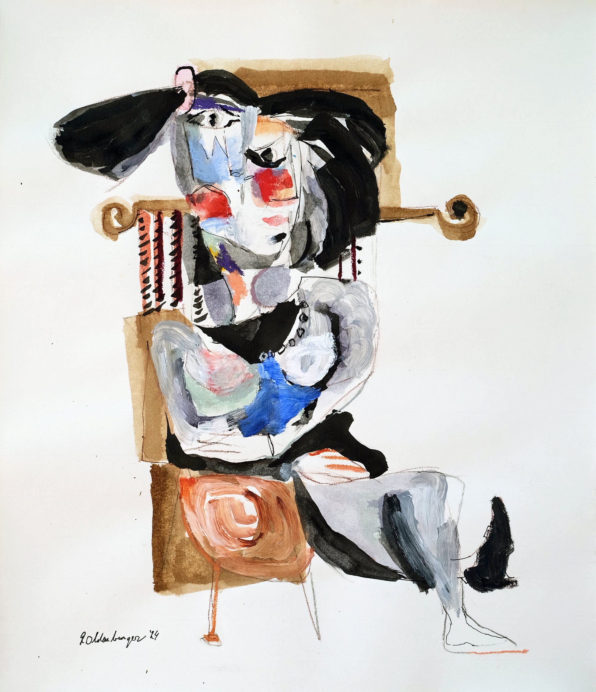 This original painting titled "Girl in Chair" is 15x18 inches in ink, acrylic, pastel, water color and oil pastels on Hahnemühle paper. It was made in Haarlem, 2024 and is signed and dated on the front. This work will ship in a cardboard box with a certificate of authenticity included.