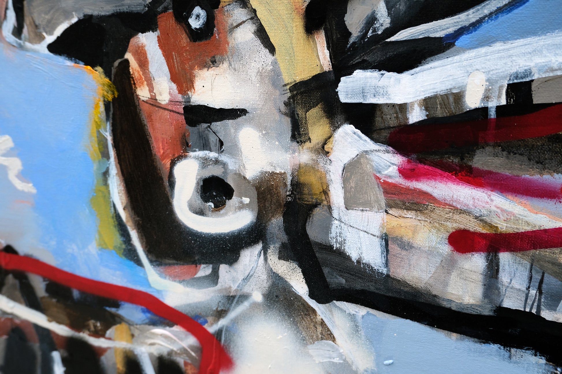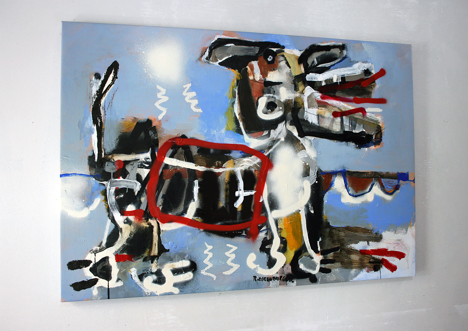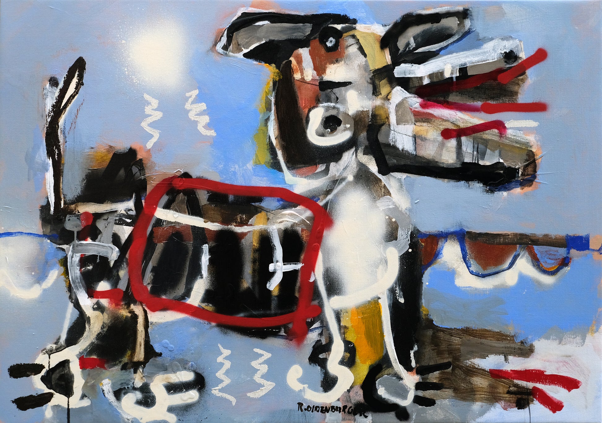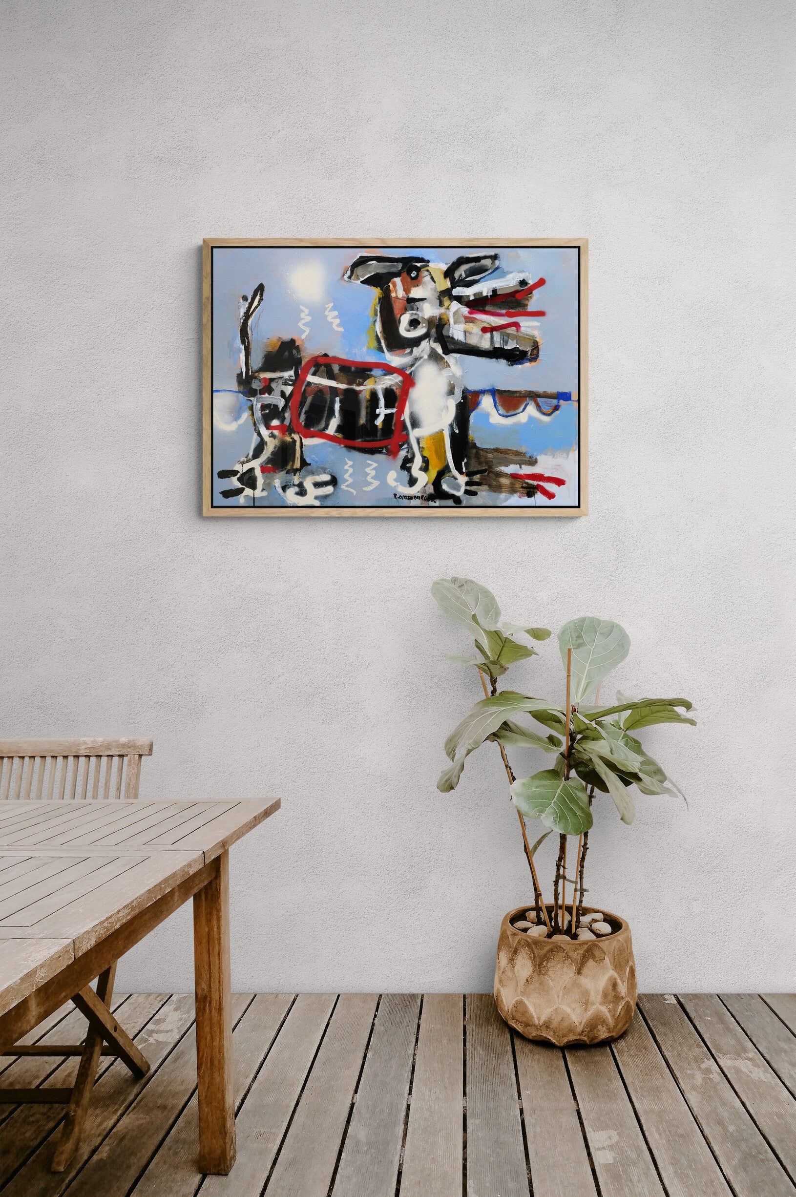 This original painting titled "Reflection of a Dog" is 34x24 inches in acrylic, oil stick and spray paint on linen. It was made in Los Angeles, March 2021 and is signed on the front and dated on the back. This painting will ship ready to hang with a certificate of authenticity included.